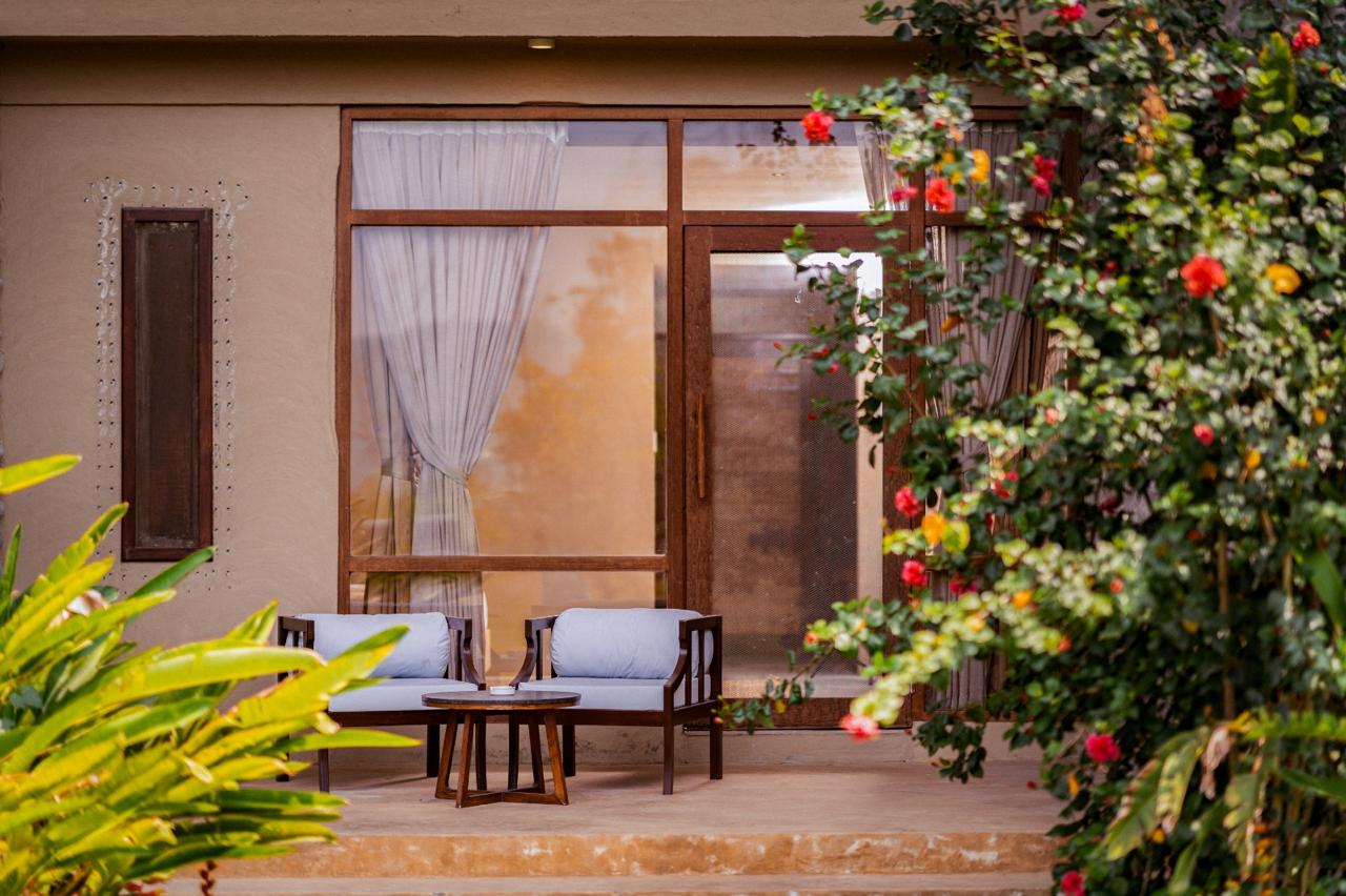 Inspired by traditional Tharu architecture, the resort’s design pays homage to the local community through sustainable materials, handwoven textures, and earthy tones. Its 27 elegant accommodations—including 8 spacious luxury villas and 19 deluxe rooms—are styled with natural wood, stone, and thatched elements, yet outfitted with modern luxuries like soaking bathtubs, plush bedding, and private patios that open to panoramic jungle or garden views.