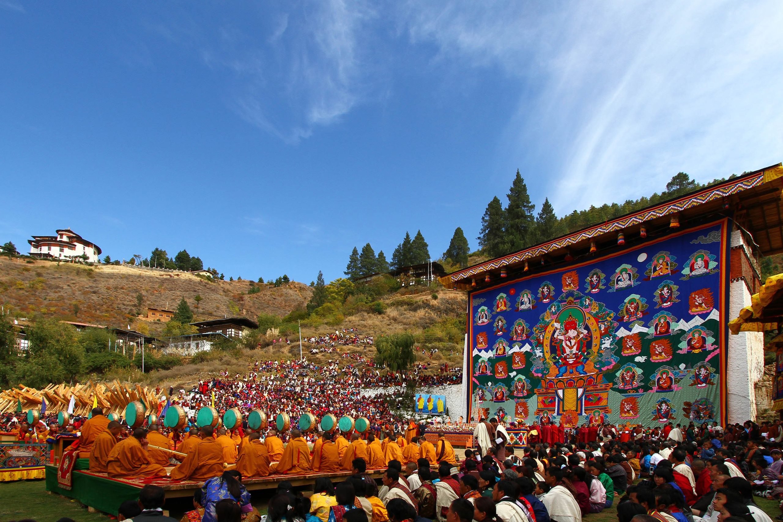 Wake up early morning to view the unfurling of the throngdrel (3-6 am), if it is to occur this year—it cannot be guaranteed. A thongdrel is a giant thangkha. Most dzongs have one of their own which they exhibit only once a year or once in three years. We cannot know in advance if it will be shown this year. Viewing it is supposed to help accumulate great merit as well as liberate the viewer from the world of samsara (reincarnation or rebirth in Hinduism, Buddhism, Jainism, Sikhism and other related religions). The thongdrel is unfurled before dawn and at the first rays of sunshine it is packed away. Afterwards, there are some dances and prayers.