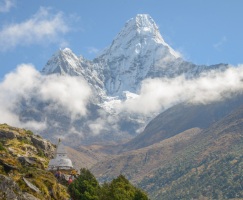 The trail climbs slowly, winding above the Imjatse River, to the main Stupa. From here, the walk is moderate as you enter the Imjatse Valley beneath the mighty peaks of Ama Dablam, Nuptse (25,790 ft.) and Lhotse (27,890 ft.) with views of the eastern snow-capped mountains including the Island Peak or Imjatse (20,305 ft.).